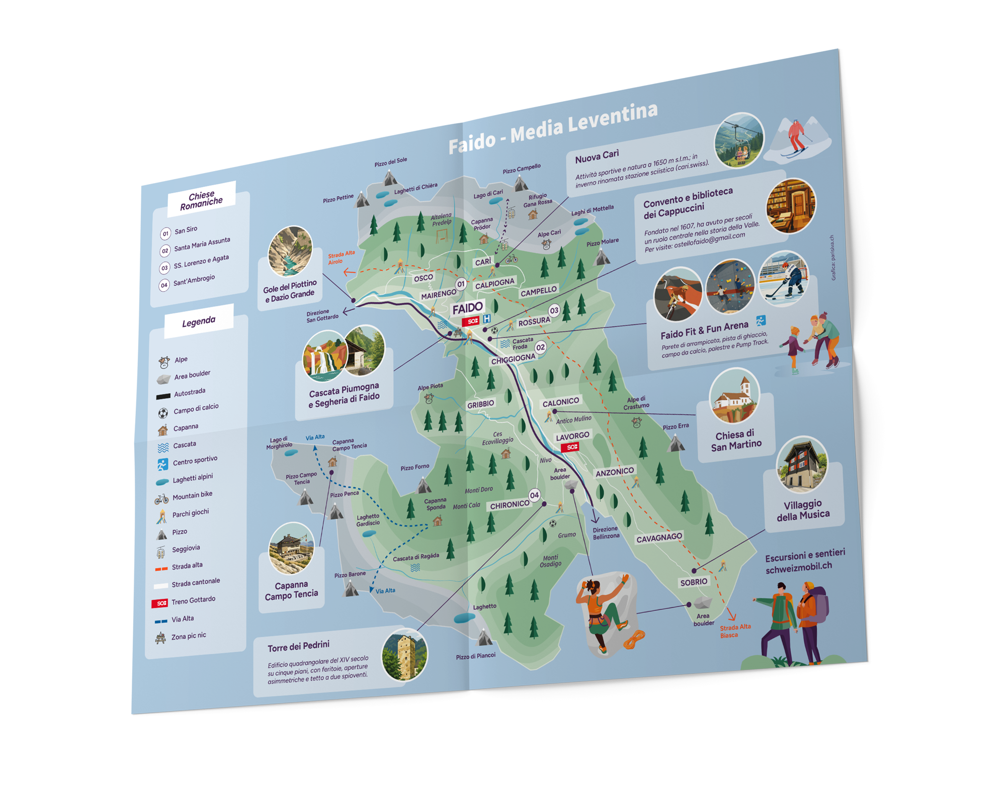Sviluppo e illustrazione di una cartina turistica dedicata alla regione di Faido, progettata per raccontare il territorio in modo chiaro e immediato. Il layout è stato studiato per facilitare la lettura e l’orientamento.